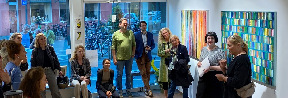 Die farbenfrohen Arbeiten mit ihren hochspannenden Texturen wussten zu begeistern und die Erläuterungen durch Kunsthistorikerin Dr. Sarah-Lena Schuster sowie die Künstlerin selbst eröffneten neue Perspektiven auf die abstrakten Werke.