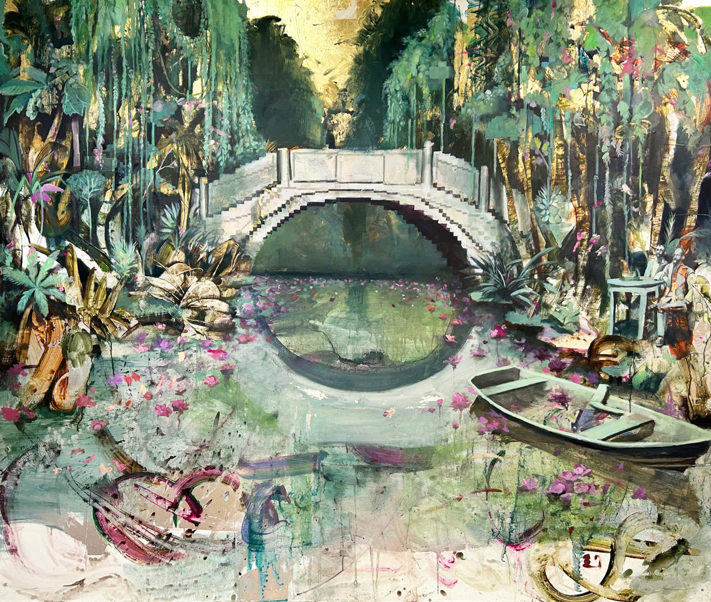 Bei genauerer Betrachtung des Gemäldes entdeckt der aufmerksame Betrachter versteckte Elemente. Der vage angedeutete Gardeoffizier und die junge, viktorianisch gekleidete Dame auf dem Scheitel der kleinen Brücke - ein Liebespaar beim ersten tête-à-tête? Als Hommage - geschickt versteckt am Bildrand (rechts) -, adressiert an die beiden famosen Künstler Gustav Klimt und Claude Monet sind selbige plauschend am Bistrotisch zu finden. Die leicht verpixelte Brücke im Bildmittelpunkt erinnert an Klimts berühmte Goldene Phase, während die impressionistische Darstellung des Wassers und der Seerosenblüten unverkennbar an Monets Seerosenbilder erinnert. Diese subtilen Anspielungen fügen eine weitere Dimension der Kunstgeschichte und künstlerischen Inspiration hinzu.