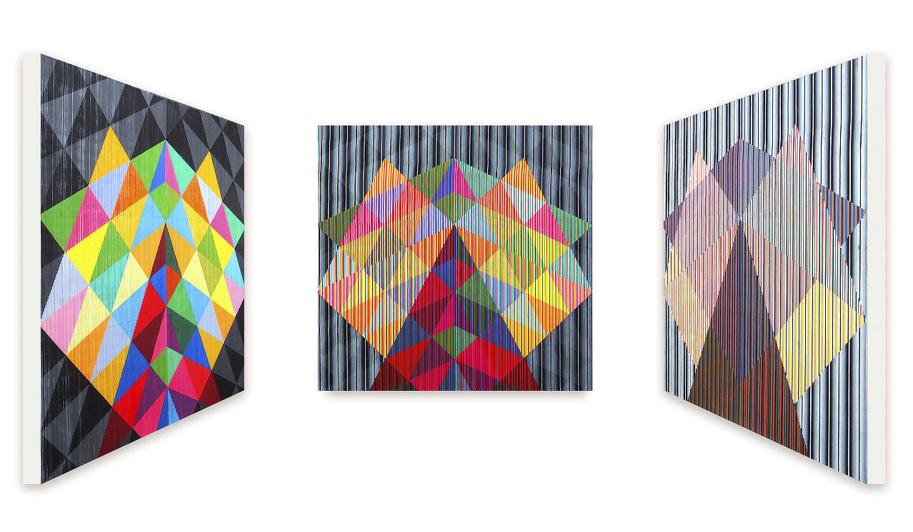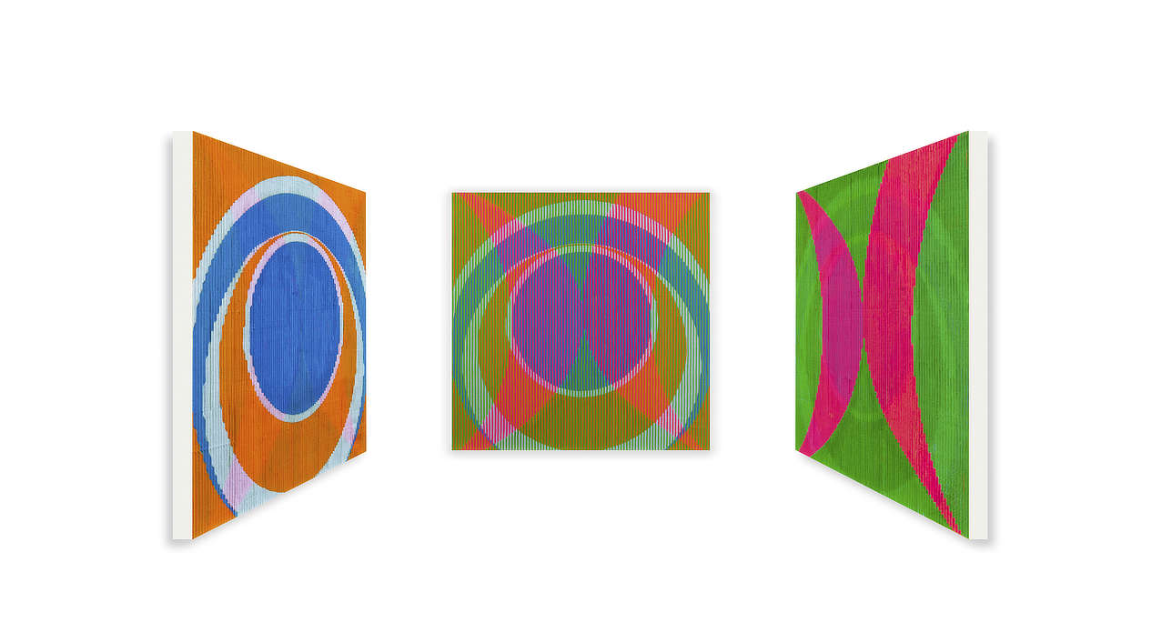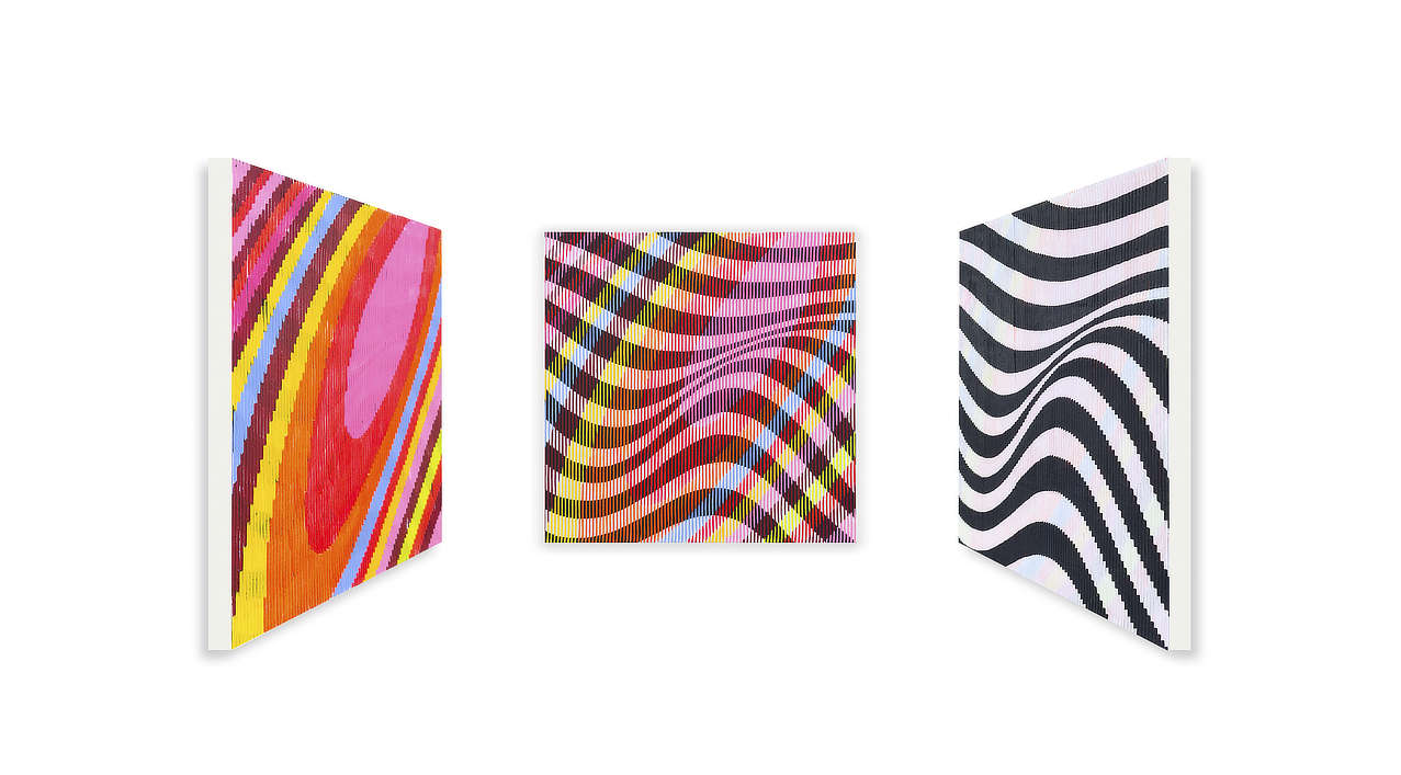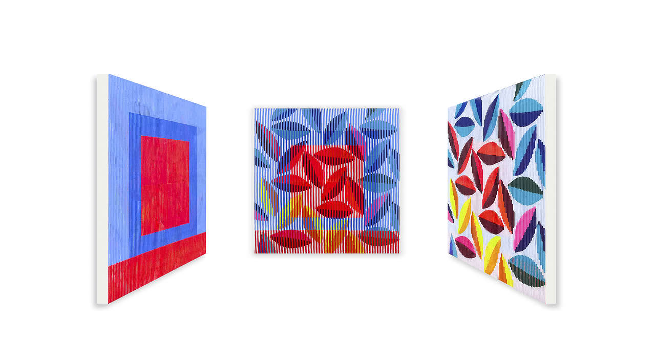 Seine Malerei entfaltet sich dreidimensional und erschließt ihre Wirkung im stetigen Wechsel der Perspektive. In Anlehnung an lentikulare Bildverfahren entstehen unterschiedliche visuelle Ebenen, die sich nicht gleichzeitig zeigen. Das Werk entwickelt seine Präsenz im Raum und im Zusammenspiel mit der Position des Betrachters.