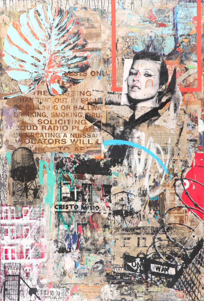 Wichtigste Inspirationsquelle für AVone ist New York; die Stadt, die niemals schläft, und die weltweit als Symbol für die Hoffnung auf sozialen Aufstieg gilt. In seinen Multi Layer-Werken greift AVone den Seelenzustand der Metropole auf, deren Wahrzeichen und Insignien er in eine äußerst facettenreiche, dabei aber poetisch anmutende Bildsprache kleidet. Die fotorealistische Wiedergabe seiner New York Ansichten wird durch eine patinierte, mal angerostete, mal wattierte Textur gebrochen und gleichsam brutalisiert wie romantisiert. Damit spielt AVone auf die Widersprüchlichkeiten der Stadt an, die sich in der Dualität von Zerfall und Wiederaufbau, Schönheit und Vergänglichkeit, Ignoranz und Überambition spiegeln. Mit Versatzstücken aus Siebdruck- und Stenciltechnik, Malerei und Tape-Art, angereicht mit Elementen aus der Comic- und Hip Hop-Kultur, kreiert AVone eine Stimmung, die den vielschichtigen Vibes der Stadt eindrucksvoll nachspürt. Und in sinfonischen Bildkompositionen gipfelt.